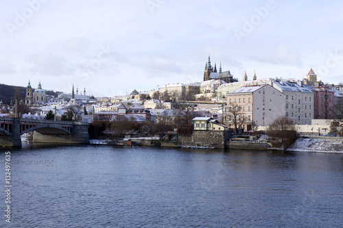 Fototapeta premium Snowy freeze Prague Lesser Town with gothic Castle above River Vltava, Czech...
