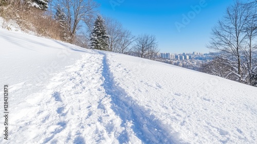 © MAKASIHMAS SIDNEY, Fototapeta premium Snowy hillside path leading to city view