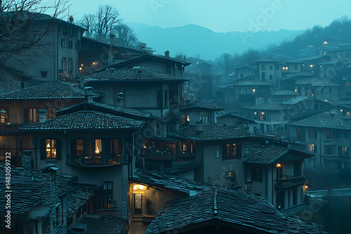 Obraz premium Snowy Hillside Village at Twilight Teal Blue Hues