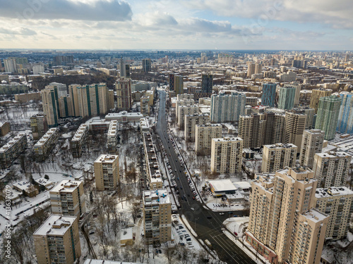 © Sergey, Obraz premium Snowy Kiev. Aerial drone view. Winter sunny morning.