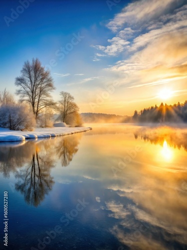 © Ningjing, Fototapeta premium Snowy lake landscape at sunrise with mist rising from the water