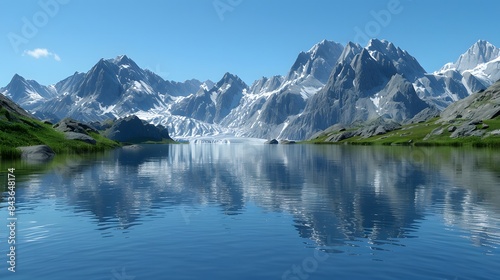 © Teerapong, Fototapeta premium Snowy Lake surrounded by mountains under a cloudy sky