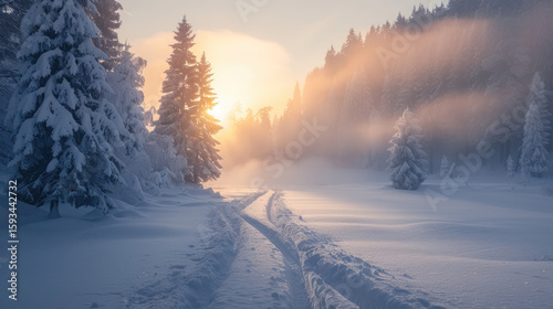 Naklejka premium Snowy landscape featuring snow-covered trees, tracks, and a sunrise...