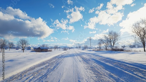 © Nakorn, Fototapeta premium Snowy landscape under heavy clouds winter road scene midrange view natural environment realistic snow textures