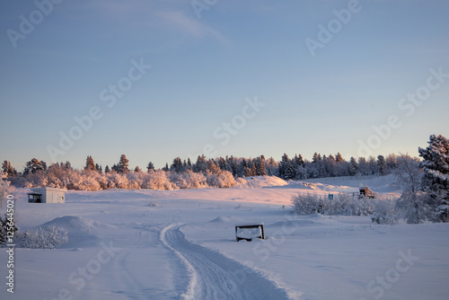 © Adam, Fototapeta premium Snowy landscape winter scene in Swedish Lapland. Kiruna, Norrbotten County.