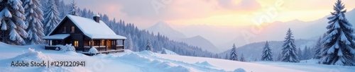 © Sayfar, Naklejka premium Snowy landscape with a cozy cottage in the distance, serene, open, cottage
