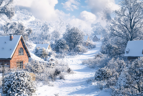 Naklejka premium Snowy landscape with a path leading to a village. The houses are small and made of brick. The scene is peaceful and serene, with the snow covering the ground and trees