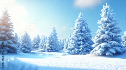 © Rosnani, Naklejka premium Snowy landscape with frosted trees under blue sky.