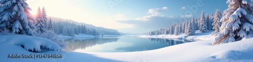 Fototapeta premium Snowy landscape with frozen lake and trees in the background, trees, frozen,...