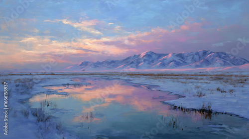 © Isa, Fototapeta premium Snowy landscape with mountains at sunset reflecting on a calm lake in winter