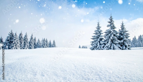 © Nashihal, Naklejka premium "Snowy landscape with pine trees and soft snow falling, overcast sky, peaceful and minimal winter background, cool blue and white tones"