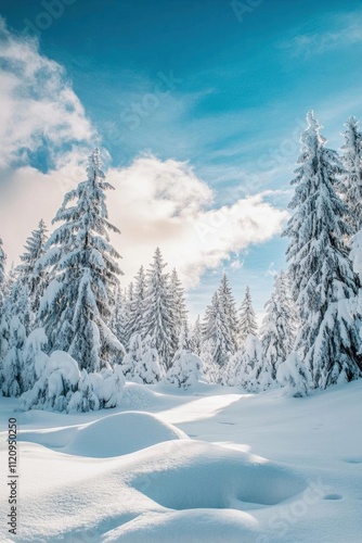 © Shofiyana, Naklejka premium Snowy landscape with tall trees under a bright blue sky.