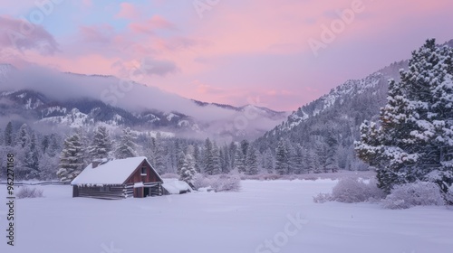 © @_ greta, Fototapeta premium Snowy Mountain Cabin at Sunrise