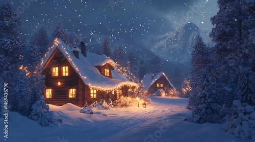 © Bagus Skak, Naklejka premium Snowy Mountain Cabin Christmas Night.