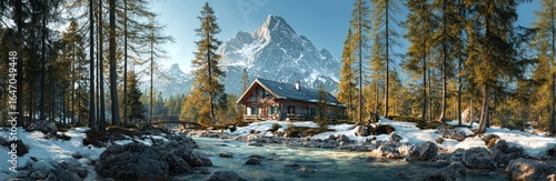 Fototapeta premium Snowy mountain chalet nestled beside a flowing stream in a pine forest