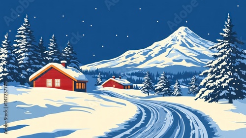 © rioyoungguns, Fototapeta premium Snowy mountain landscape with small houses and star-filled sky.
