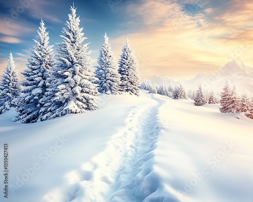 © Bibi, Fototapeta premium Snowy Mountain Path at Sunrise.