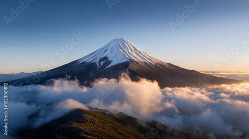 Fototapeta premium Snowy mountain peak surrounded by misty clouds at sunrise, showcasing serene...