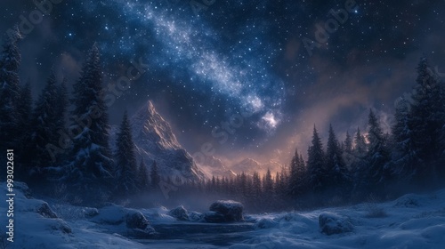 © Digital Dreamscapes, Obraz premium Snowy mountain peak under a starry night sky.