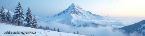 © Waramit, Obraz premium Snowy mountain peak with misty atmosphere and bare trees, landscape, natural