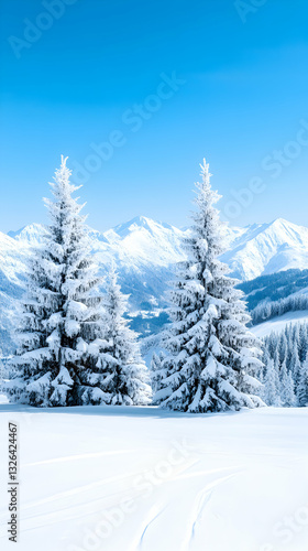 © Nadiyah, Naklejka premium Snowy mountain peaks and frosted pines