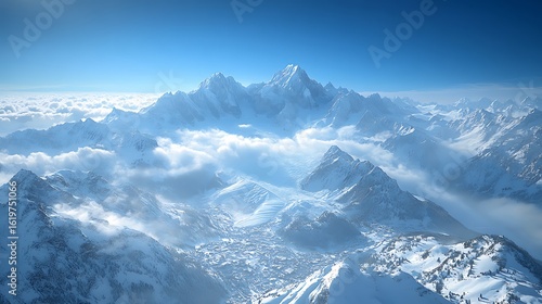 Obraz premium Snowy mountain peaks and valleys shrouded in clouds.