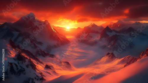 © Siasart, Obraz premium Snowy Mountain Peaks Glow at Sunset with Orange Hues