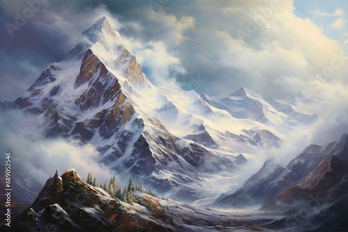 © Kritchanok, Naklejka premium snowy mountain peaks, oil painting