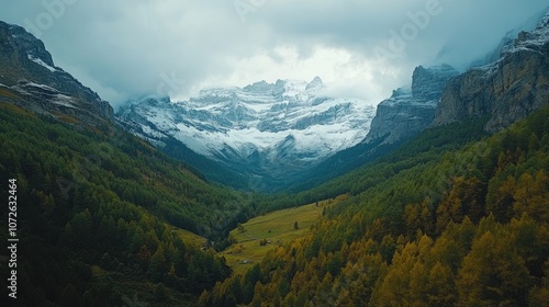 Fototapeta premium Snowy mountain peaks towering over lush green valley in the alps