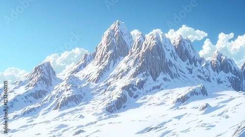 Fototapeta premium Snowy mountain range landscape, sunny day, clouds, travel poster