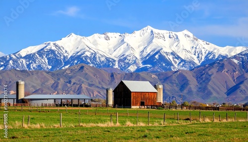 © Lepo, Obraz premium Snowy mountain range with a rustic barn in the foreground
