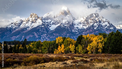 Fototapeta premium Snowy mountain range with autumnal forests