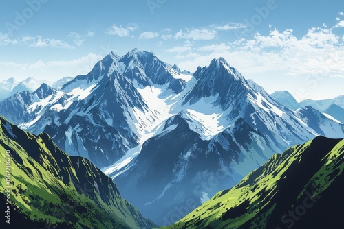 © Munardesign, Fototapeta premium Snowy Mountain Range with Green Slopes and Blue Sky
