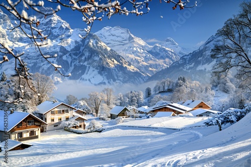 © Satyam, Fototapeta premium Snowy Mountain Town A Winter Wonderland Generative AI