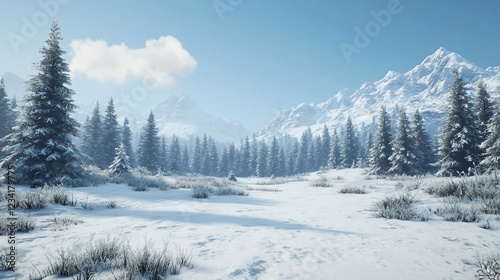 Fototapeta premium Snowy mountain valley winter landscape, serene background, game asset
