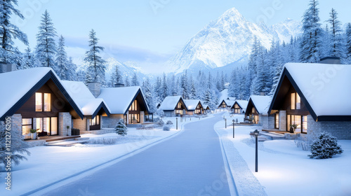 © Sirichai, Naklejka premium Snowy Mountain Village Escape