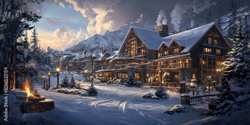 Fototapeta premium Snowy mountain village with lit windows.