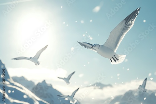 Fototapeta premium Snowy Mountains, Birds Soar, Winter Flight