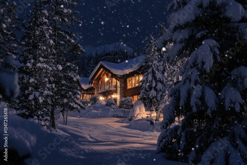 © iting, Fototapeta premium Snowy night chalet illuminated by lights, snowfall in winter forest