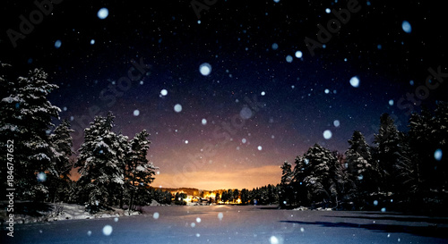 © Rikta, Fototapeta premium Snowy Night Landscape with Falling Snow and Starry Sky Over a Village winter