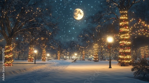 Obraz premium Snowy Night Scene with Decorated Trees and Full Moon