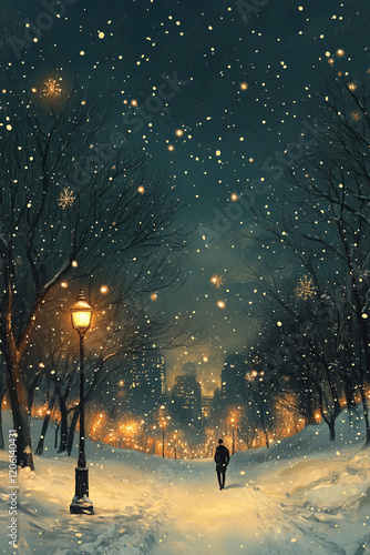 © Myartsam Design, Obraz premium Snowy Night Stroll Through a City Park with Lights