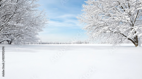 Obraz premium Snowy open field framed by snow covered trees under pale blue sky, calm...