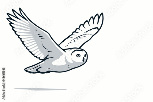 © Bay, Obraz premium Snowy owl gliding with wings spread against a minimalist background