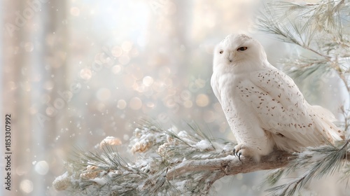 © fotofabrika, Obraz premium Snowy owl perched on a pine branch in a quiet winter setting with falling snow