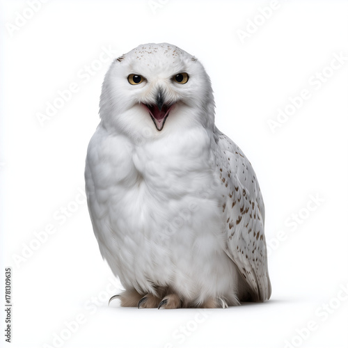 Naklejka premium Snowy owl screeching with open beak.