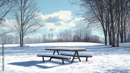 © TatChong, Naklejka premium Snowy Park Bench Winter Landscape