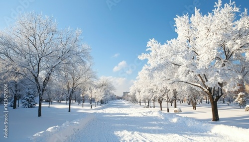 © talkative.studio, Fototapeta premium Snowy park lane under bright sky
