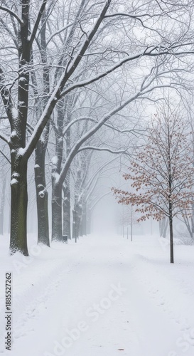 © vadosloginov, Fototapeta premium Snowy park path winter trees fog