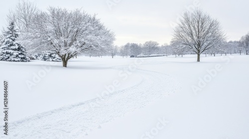 Fototapeta premium Snowy park path, winter wonderland scene